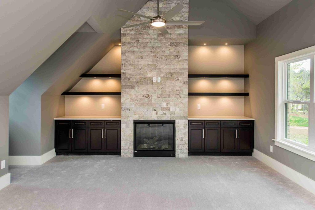 The exterior of 1105 Easterly Court is a showcase of architectural excellence, featuring a sophisticated mix of natural stone, warm-toned brick, and elegant shingle siding. The grand rooflines and detailed gables create a stately presence, while the dark wood-grain garage doors add a touch of rustic luxury. Every element of the facade has been designed to maximize curb appeal, ensuring that this residence is as visually commanding as it is durable, a hallmark of the premium builds delivered by Shail Construction.