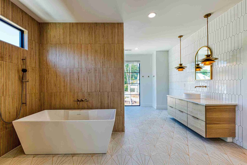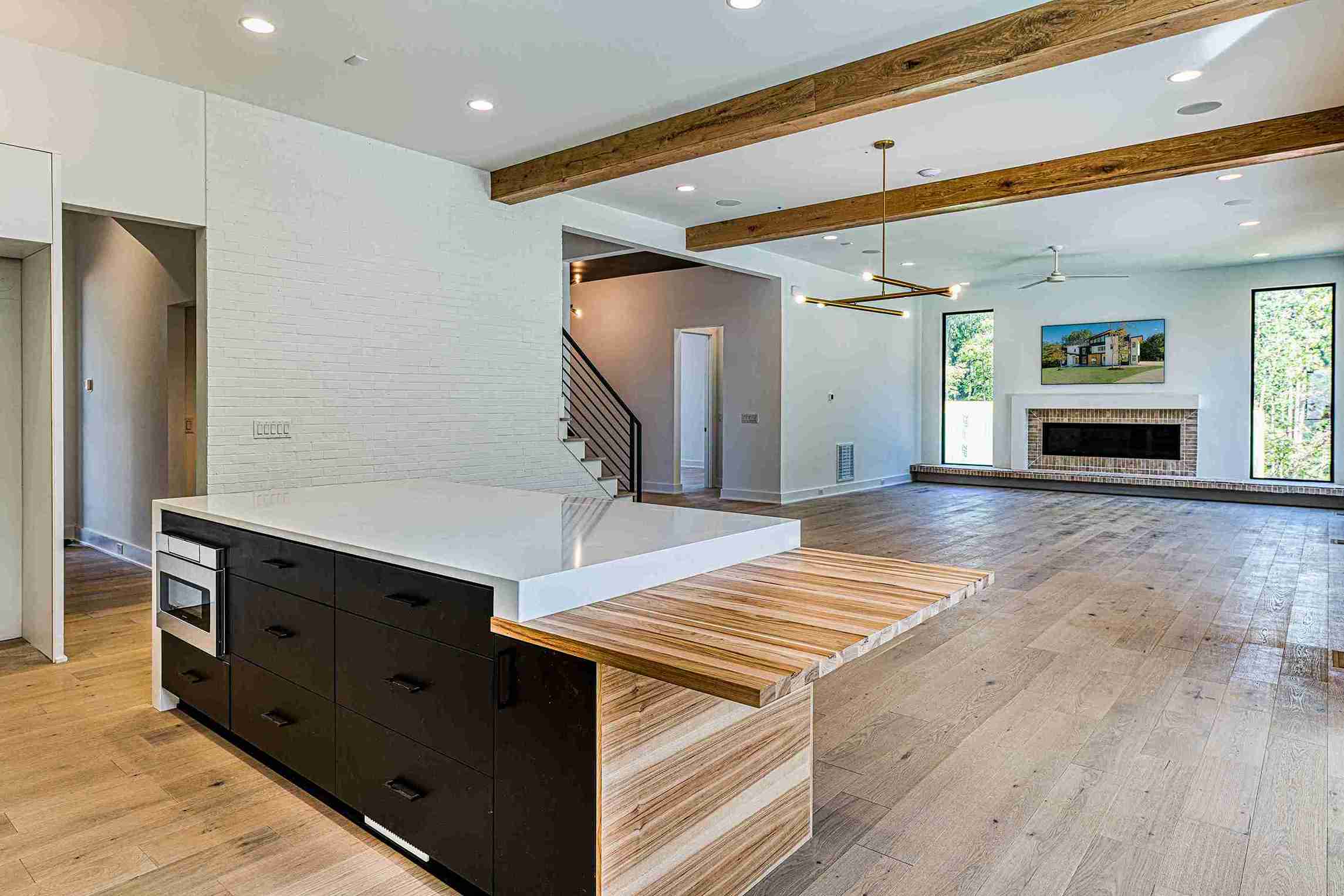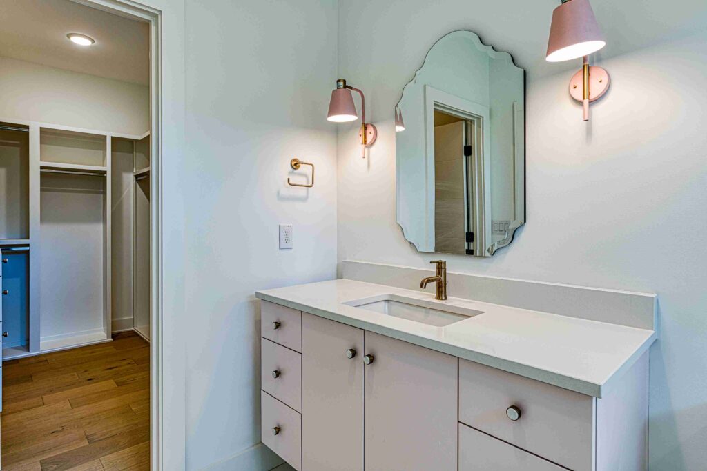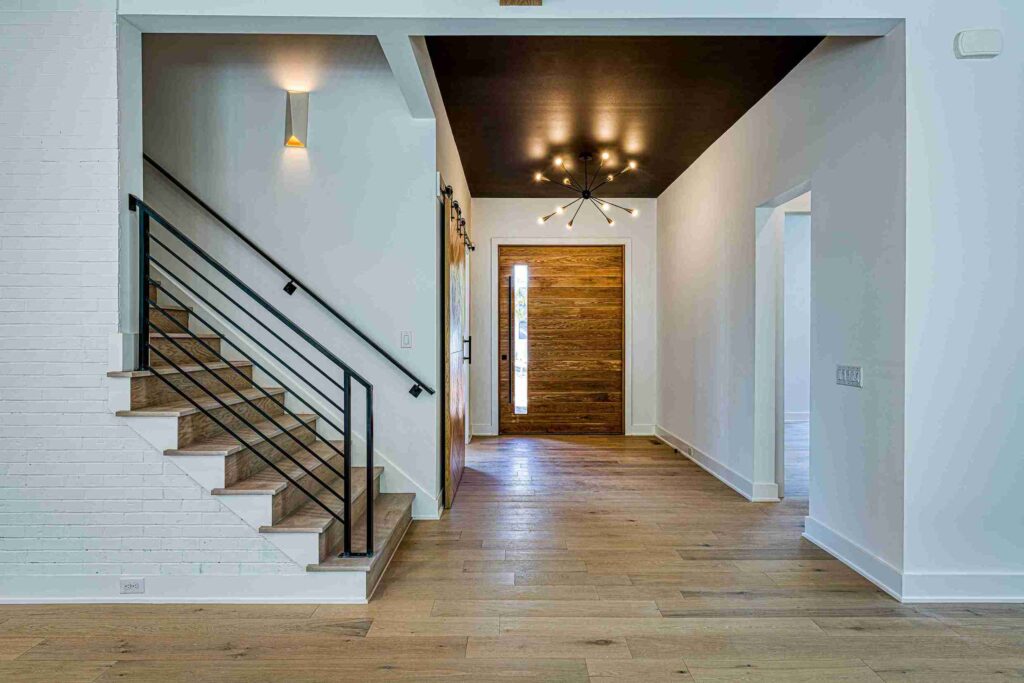 The exterior of Lot 9 Bella Terra is characterized by its dynamic use of mixed materials and geometric forms. The interplay between the clean white masonry, dark vertical accents, and natural wood textures creates a striking visual profile that commands attention. Every architectural line has been meticulously planned by Shail Construction to ensure maximum curb appeal while maintaining the structural integrity and high-performance standards of a custom luxury build.